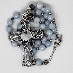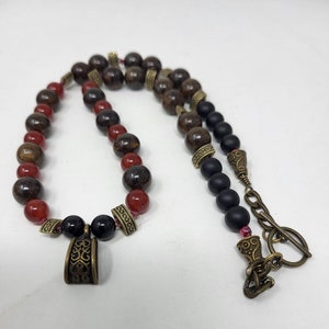 Beautiful and unique single strand hand beaded necklace of aquamarine magnesite and sea shell beads (10mm). The necklace is 16 inches long with a round single polished black onyx bead (30mm diameter) with two large brass beads at each side. Seed beads are found in between each one of the magnesite beads. Brass toggle clasp.