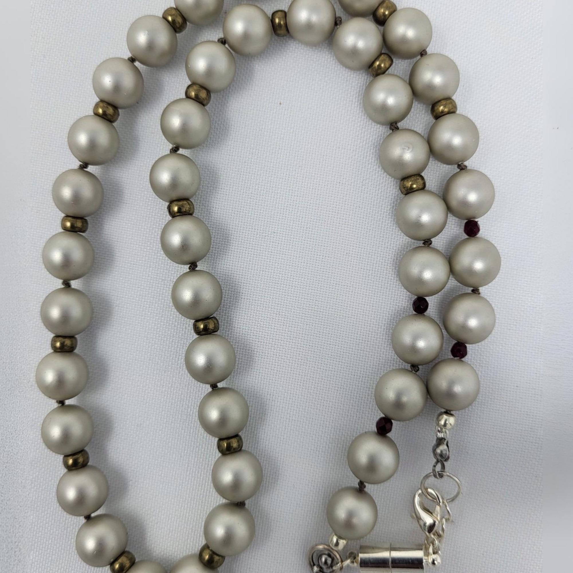 Single strand necklace of grayish 10mm pearls silk knotted, accented with brass roundeles. Magnetic and lobster clasp combined for ease of putting necklace on.